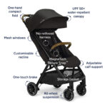 Whether you’re navigating city streets or jet-setting across the globe, the TRVL stroller combines luxury materials with innovative features, making it perfect for parents on the go. Its one-hand compact fold allows for easy transitions, while the stroller stands on its own when folded, providing hands-free convenience.